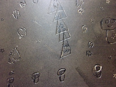 スチレン板に跡を付けると、その部分が凹み、版ができあがります。