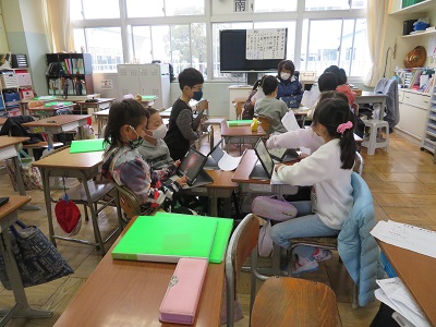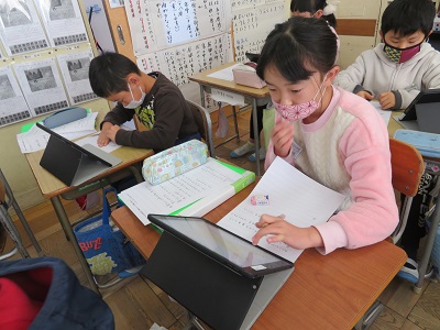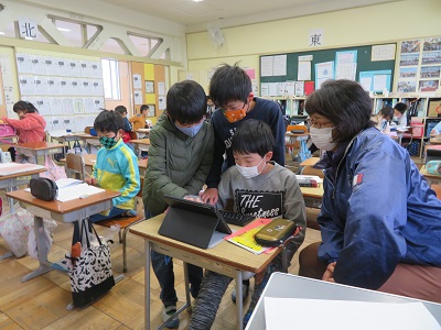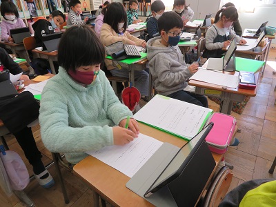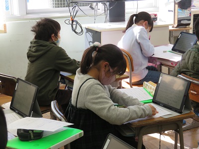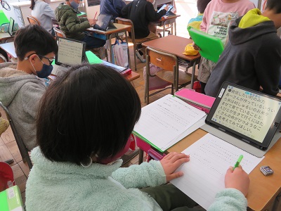 学習したことをタブレットでまとめ、発表している様子を、3月の学年懇談会で見ていただきます。