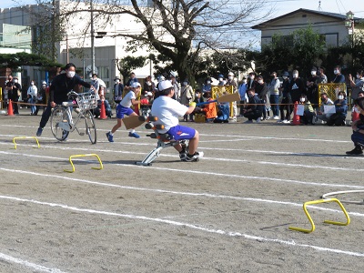 この競技は、「ピクトグラムがやりたい」という6年生の運動会実行委員のアイディアから生まれました。くじを引いて、バドミントン、ウエイトリフティング、ボッチャ、卓球、カヌー、自転車のパフォーマンスを行います。
