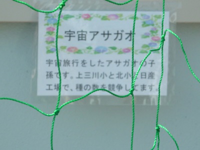 玄関から少し北側を見てください。宇宙アサガオが暑さに負けず伸びてきています。