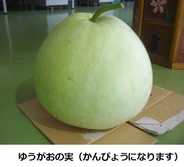 3年生社会科の学習のために、毎年「ゆうがおの実」をかんぴょう農家さんが、届けてくださいます。今年も、玄関で皆さんをお迎えしています。