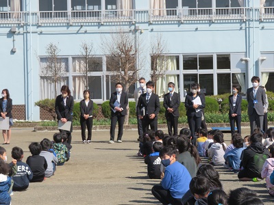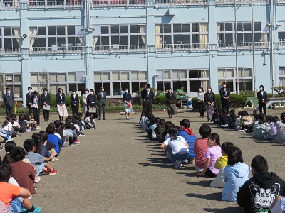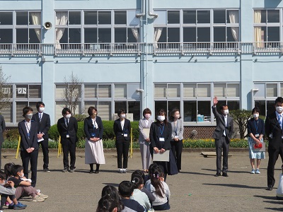 名前を呼ばれた先生方は、担当のクラスの前に立ち、子供たちに挨拶をしました。