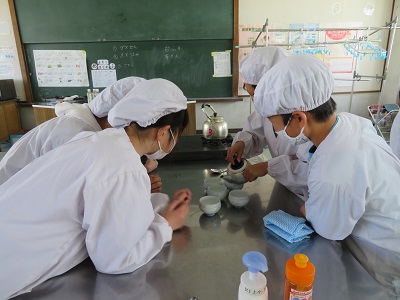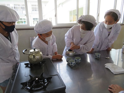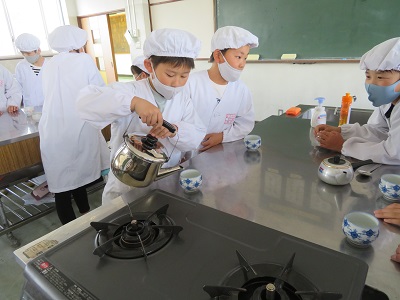5年生は、ガスコンロでお湯を沸かして緑茶を入れる学習をしました。