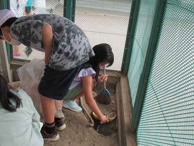 ウサギ小屋では、フンの掃除をしたり、えさやりを行います。