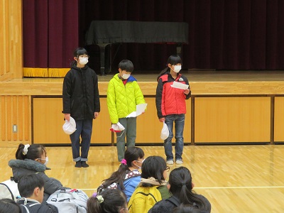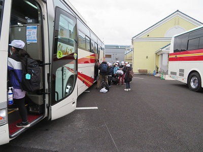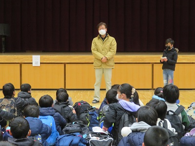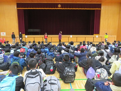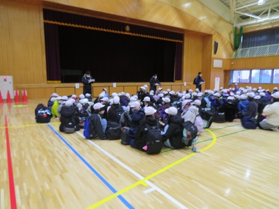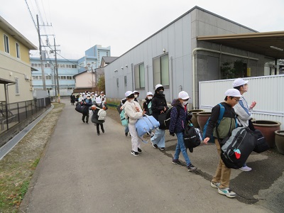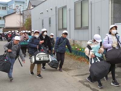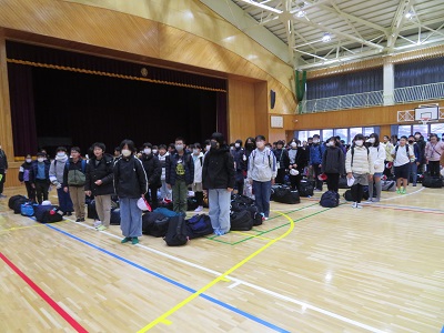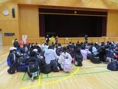 大きな荷物は、昨日の夕方体育館に運び込み、朝は登校班でリュックをしょって登校しました。