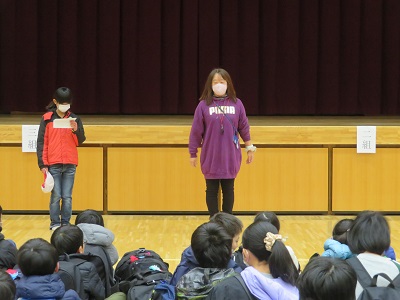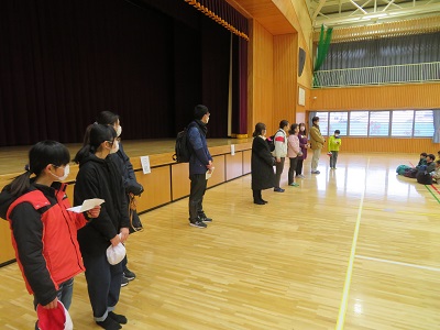 担任の先生が、体育館にクラスごとに集合し、健康観察をしました。