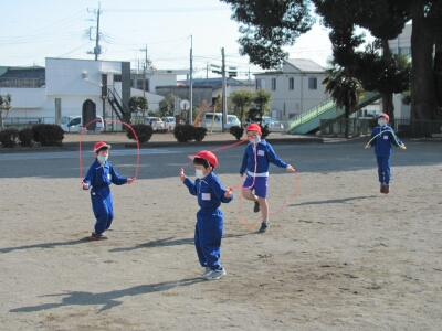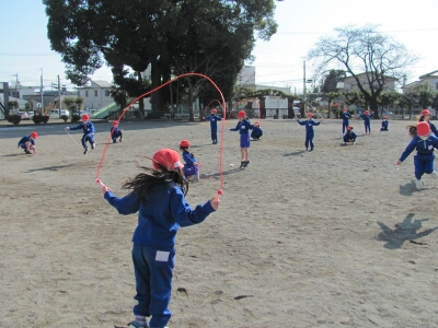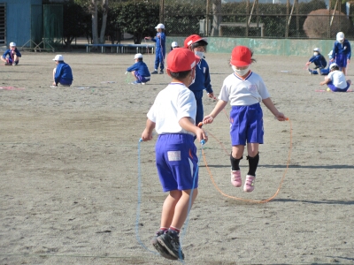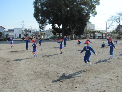 1年生のなわ跳び記録会は、体育の授業中に1・3組と2・4組に分かれて行いました。跳び続けた時間で順位を決定します。