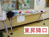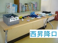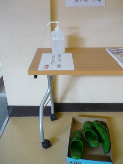 東西の昇降口に消毒と落とし物コーナーを係が用意しました。