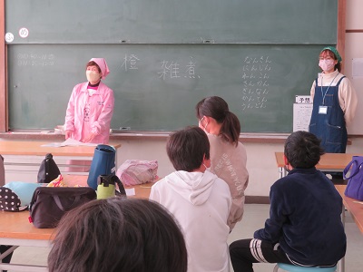 調理実習をしていない子たちは、隣の部屋で食改善推進員さんから、季節の料理についてのお話を伺いました。