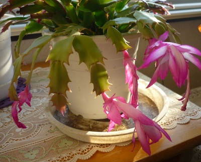 校舎の中では、ジャコバサボテンの花が児童の登校を待っています。