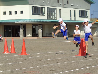 体育の時間に学習した「ハードル」「高跳び」「ボール投げ」をリズムよく行ってゴールします。