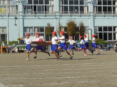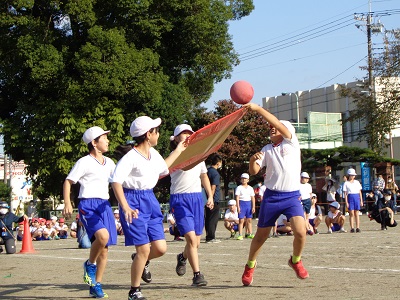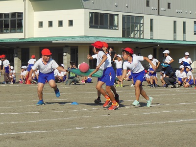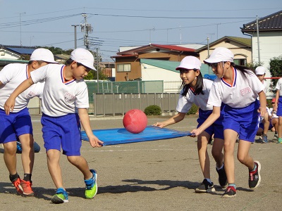 次は、3、4年生で協力して行う団体競技「運べ、聖火ボール」です。