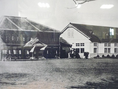 この写真は、大正から昭和にかけて使っていた、木造校舎と講堂です。