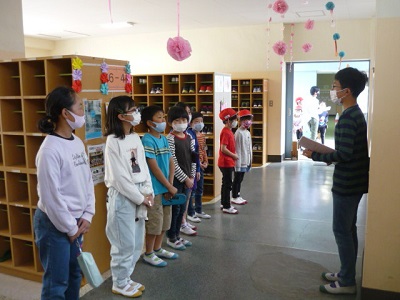 全員の自己紹介が終わると、なかよし班清掃の場所へ移動し、清掃分担や挨拶の仕方を班長が指示しました。