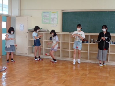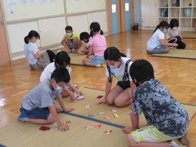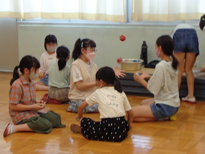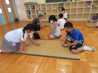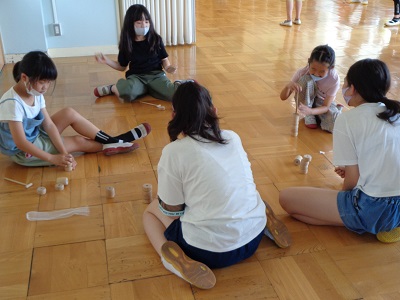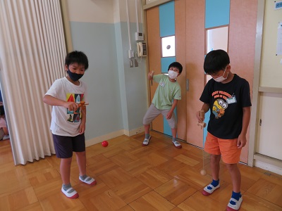 昔遊びクラブでは、けん玉やお手玉など、昔から伝わる遊びを、2つのグループに分かれて体験しています。