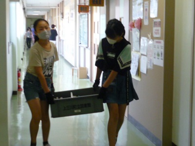 業間休みを使って、全クラスの回収箱を集めました。
