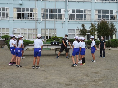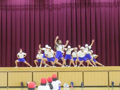 なかよし班の6年生が5年生に踊り方を教えています。5年生が6年生に分からないところを質問したり、もっとこうすると格好良くなるよとアドバイスをもらったりして、どんどん上手になっていきました。