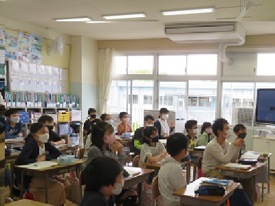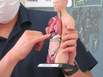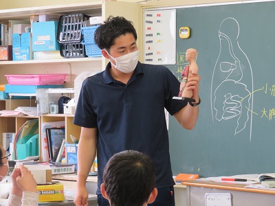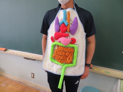 まず、実際の体の位置にどのように臓器が付いているか分かるエプロンを着て、大きさや形を確認しました。臓器ごとに色が違い、子供たちにはとても分かりやすかったようです。次に、人体模型を使った説明を聞きました。自分の体の中が、こんな風になっているのかと、みんな真剣に授業を受けていました。6年担任より