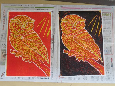 彫る→刷る→洗うを2~3回繰り返し、最後に黒いインクで刷ったらでき上がりです。