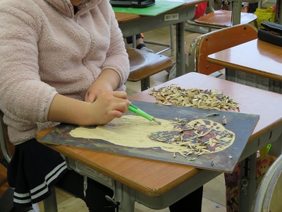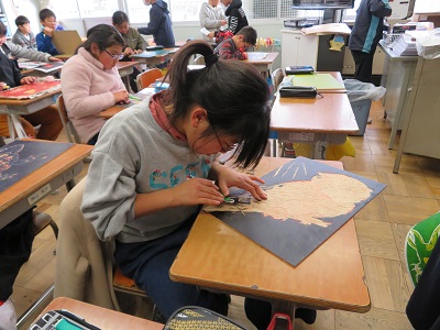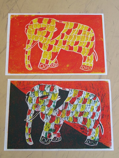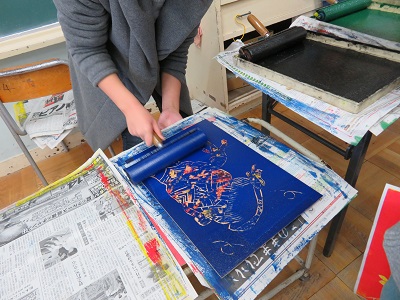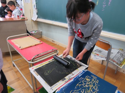 5年生の版画は、木版画の多色刷りです。