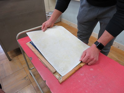 先生手作りの、紙合わせに版木を置き、ずれないように紙を置きます。