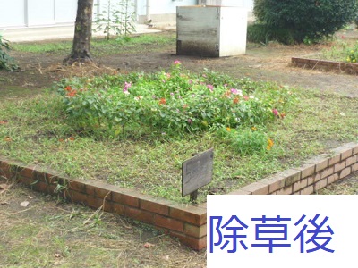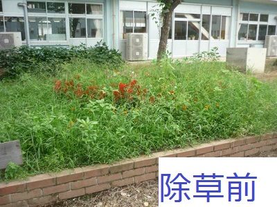 中庭の花壇も夏休み明けは、雑草だらけ