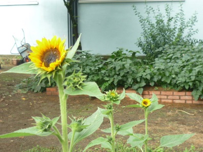 少し遅く蒔いたひまわりが、やっと咲きました。
