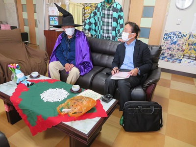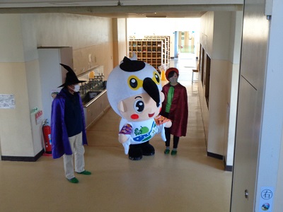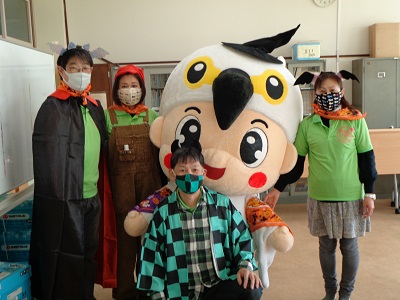 ハロウィンには、収穫祭の意味合いもあるので、子供たちを喜ばせるために、仮装しました。