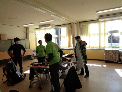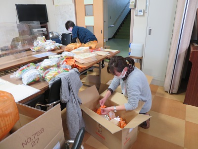 お菓子とタオルの袋詰めは、授業が終わった先生方も手伝い協力して行いました。