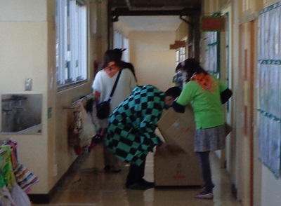 子供たちが、昨年度の収穫祭の振り返り動画を見ている時間を使って、気付かれないように、廊下にプレゼントを運びました。