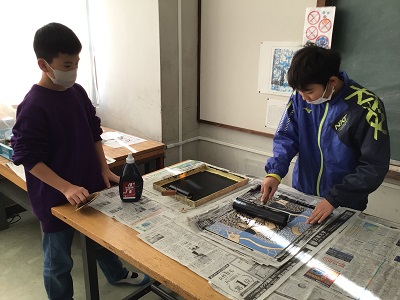 彫り終わったら、刷る作業に入ります。木版画も3年目です。