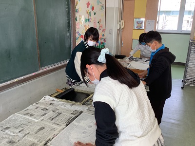 彩色木版画とは、黒一色の木版画の裏面から絵の具で彩色するものです。昨年は、人物を彫ったので、今年はそれぞれが選んだ生きものをテーマにすることにしました。