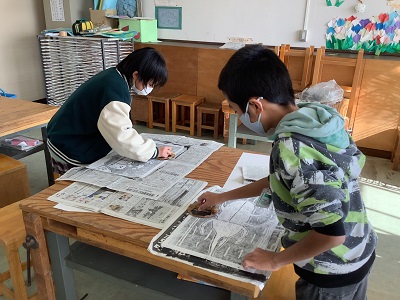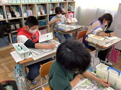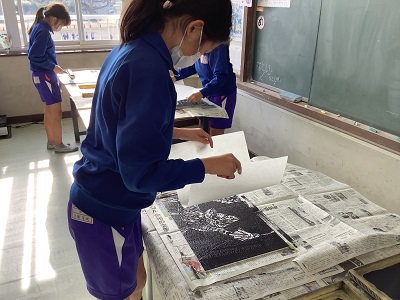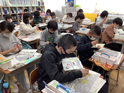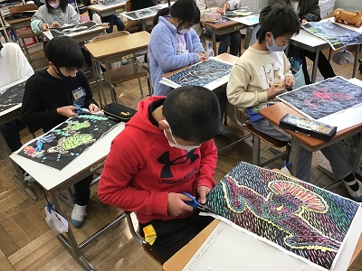 5年生は「生きもの」をテーマに彩色木版画に挑戦しました。