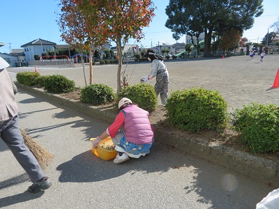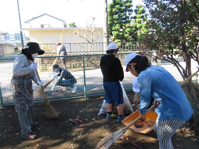 5年生が休み時間になり校庭に駆けつけると、ボランティアさん達はすでに落ち葉掃きを始めていました。