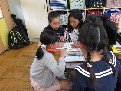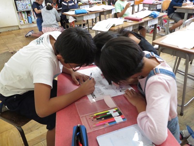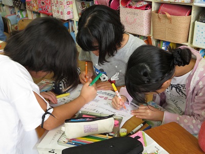 今年は、4年生が各クラス5枚ずつ、色を塗ったりメッセージを書いたりしました。