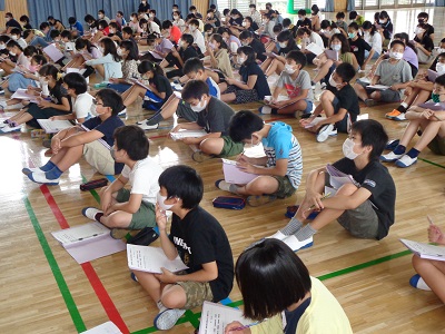 最初のオリエンテーションは、密にならないように注意して体育館で行いました。