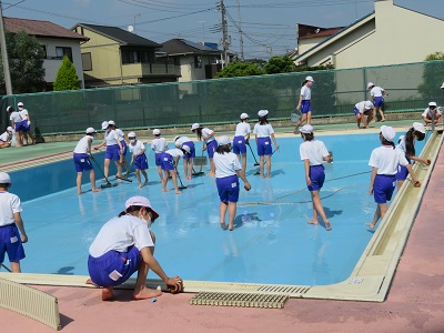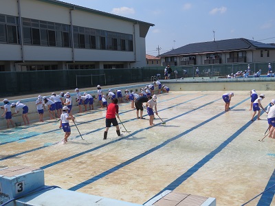 先生方とPTA体育委員さんによるプール清掃の後、6年生がプール清掃をしました。