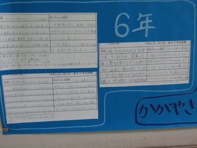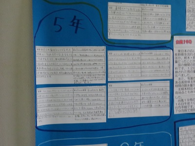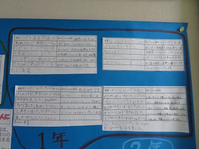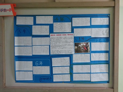 各クラスから1枚ずつ出してもらい、図書室の廊下に掲示しました。
