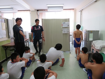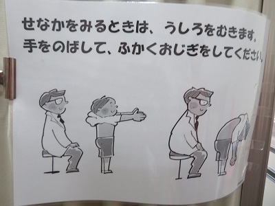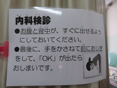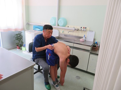 心臓の音を聞くだけでなく、背骨のわん曲も調べます。