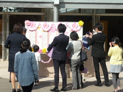 新入生と保護者の皆さんが、クラス名簿を見ています。