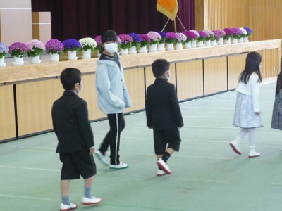 教室でお手伝いをしていた6年生が、一緒に入場して着席まで面倒を見ました。