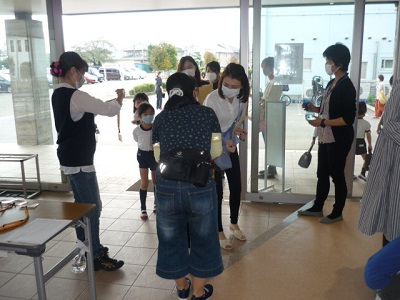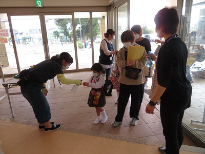 体育館の入り口やトイレの前では、ボランティアの方が消毒をしました。