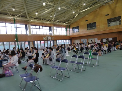 体育館の中も、前後の間隔を開けて椅子を並べました。