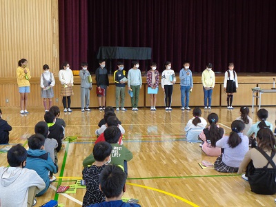 前に出て挨拶をしているのは、宿泊学習を盛り上げる実行委員のメンバーです。