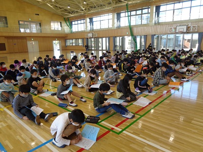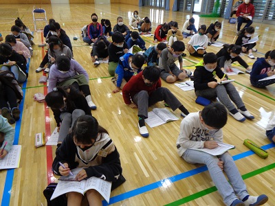 全体指導では、持ち物や日程について、メモをとりながら真剣に聞いています。