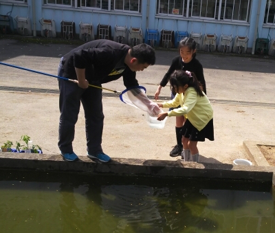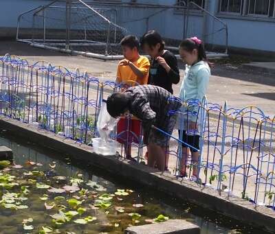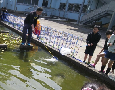 理科の観察のために、中庭の池からメダカを捕獲しました。