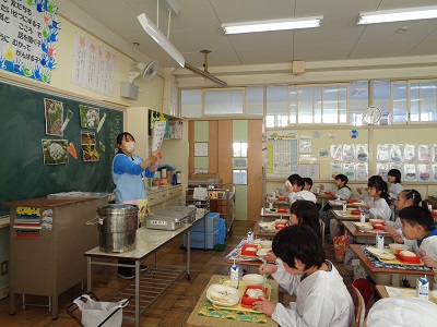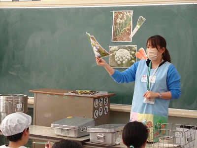 給食の時に、 給食センターの栄養士さんが野菜の栄養についてお話ししてくれました。