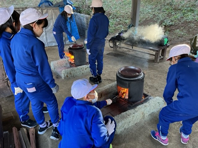 塩作りの様子です。かまどに薪を組み、海からくんできた海水を煮詰めて塩を作ります。