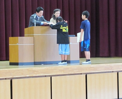 終業式の後に、ミニバスケットボール大会の表彰がありました。