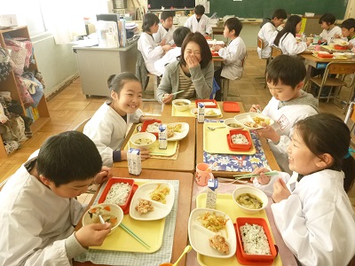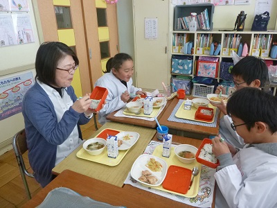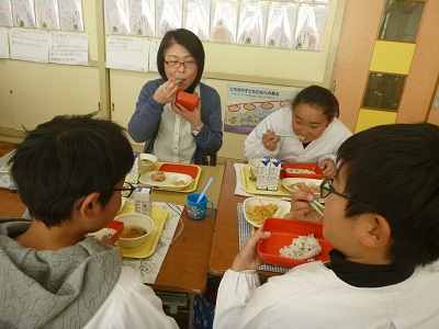 今年は、ニラ生産者の方、栄養教諭、給食センター調理員の方が、4年生と一緒に給食を食べました。